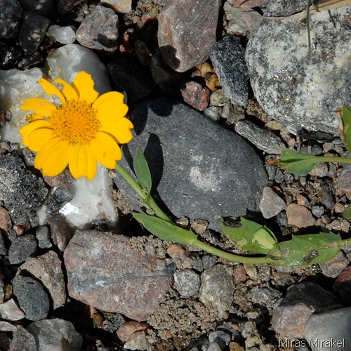 En ensam liten Gullkrage, Chrysanthemum segetum L. Den enda jag någonsin sett här. Dessutom växte den upp under en sten och såg en smula platt ut efter att jag lyft bort stenen. Hoppas den rest på sig nu och sätter frukt och frö.